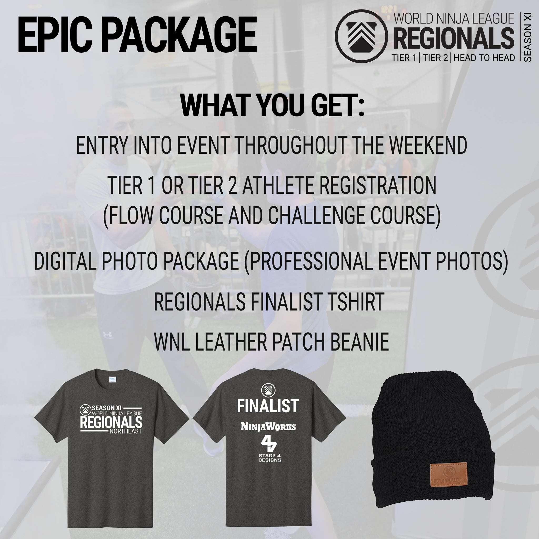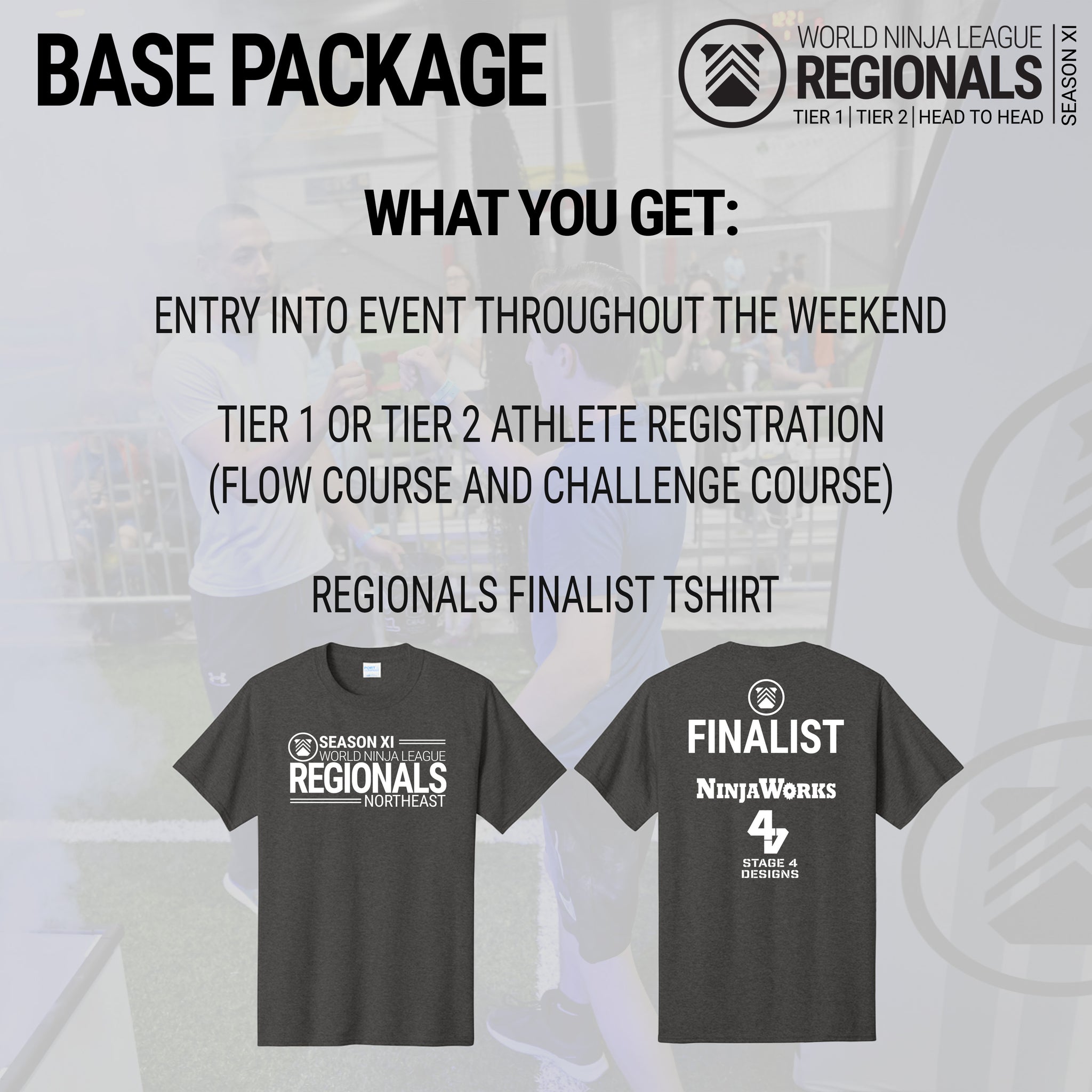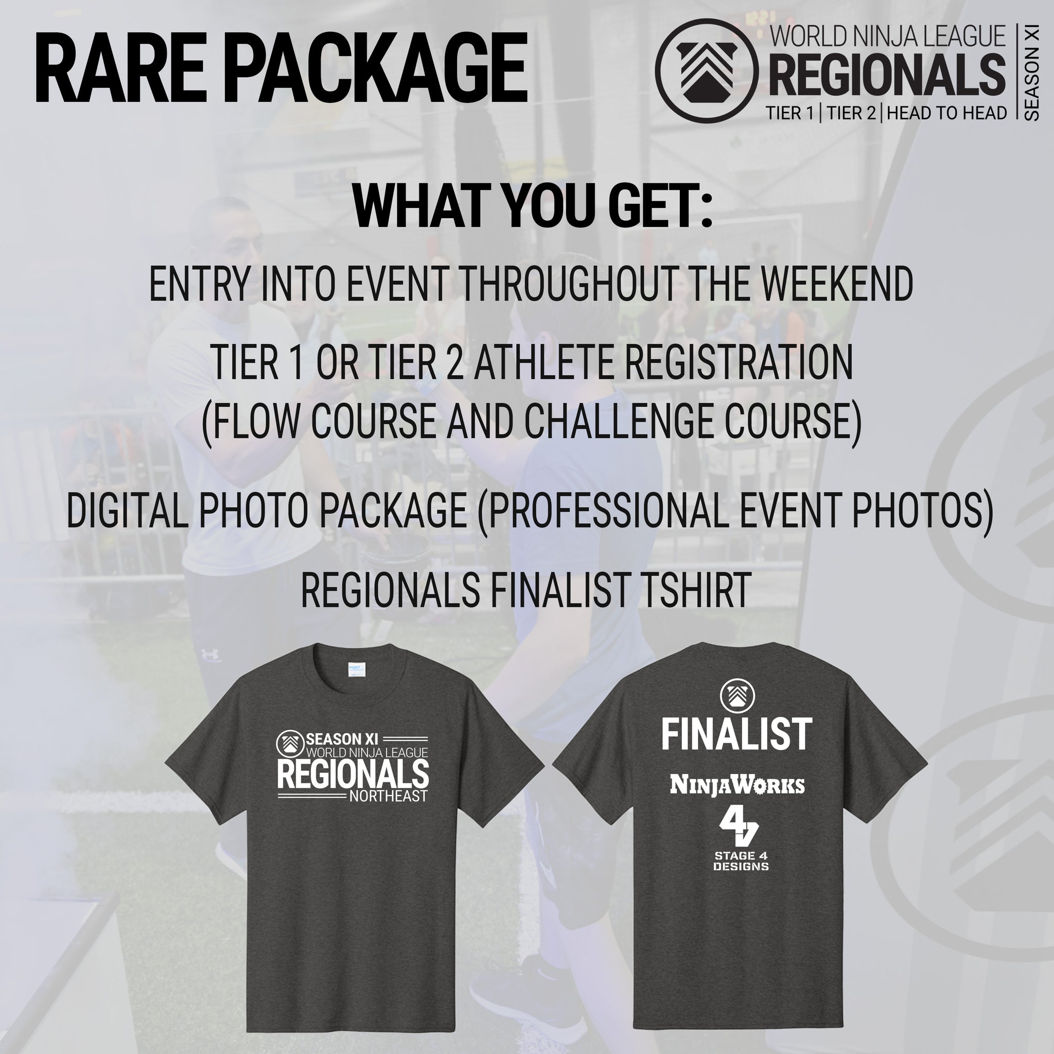 Registering to compete will automatically enroll athletes in two courses. These two courses will test an athlete's speed, technique, and strength in an exciting Regional Championship format. Athletes will be able to show off their incredible talent, competing to secure their position at the World Ninja League Championships.